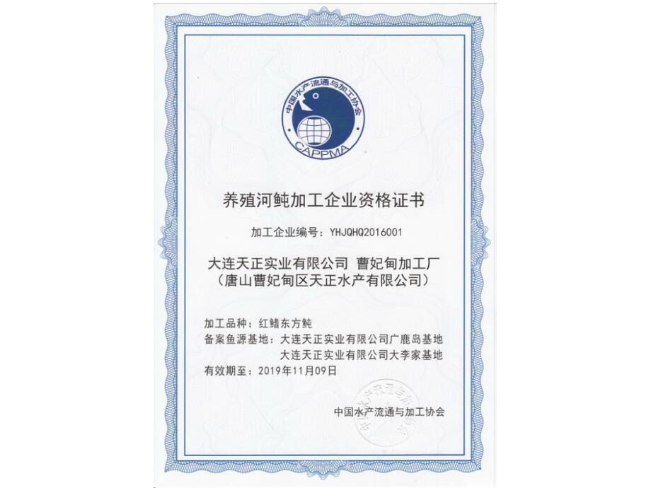 2017年3月6日,天正集團(tuán)獲中國(guó)水產(chǎn)流通與加工協(xié)會(huì)正式頒發(fā)《養(yǎng)殖河鲀加工企業(yè)資格證書》