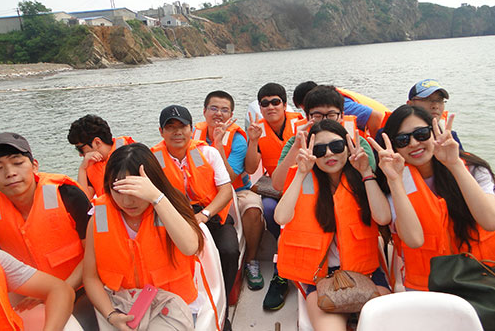 2013年8月22日,大連海洋大學(xué)趙前程院長及韓國蔚山科學(xué)大學(xué)畢業(yè)生來到天正休閑漁業(yè)基地,他們在休閑漁業(yè)導(dǎo)游張立娜的引導(dǎo)下,登陸快艇,體驗異國海上風(fēng)光,感受紅旗東方鲀養(yǎng)殖文化。他們開心的坐在游艇上,拿著照相機(jī)快速按下喜悅的快門,一處處異國風(fēng)光環(huán)繞著他們,一排排養(yǎng)殖紅旗東方鲀的網(wǎng)箱映入眼簾,他們在快樂中學(xué)習(xí)網(wǎng)箱養(yǎng)殖河豚魚知識,在愉悅中體驗海洋文化。
